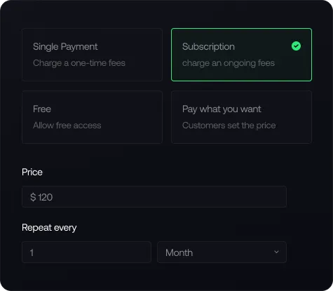 Set your own pricing model with options for yearly or monthly subscriptions, one-time fees, discounts, and free trials. You control how and when to charge customers for your product.